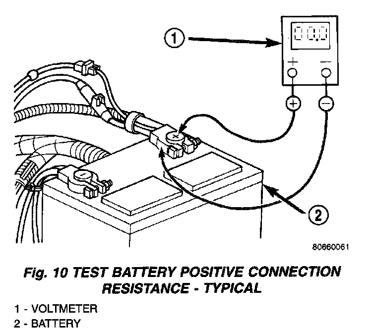 2. Connect the positive lead of the voltmeter to the battery positive terminal post. Connect the negative lead of the voltmeter to the battery positive cable terminal clamp (Fig. 10). Rotate and hold the ignition switch in the Start position. Observe the voltmeter. If voltage is detected, correct the poor connection between the battery positive cable terminal clamp and the battery positive terminal post.