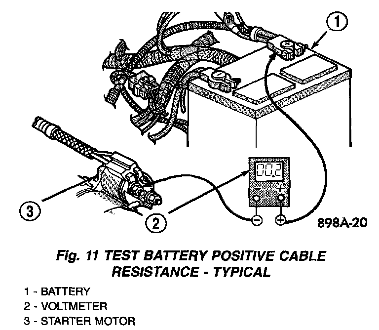 3. Connect the voltmeter to measure between the battery positive cable terminal clamp and the starter solenoid B(+) terminal stud (Fig. 11). Rotate and hold the ignition switch in the Start position. Observe the voltmeter. If the reading is above 0.2 volt, clean and tighten the battery positive cable eyelet terminal connection at the starter solenoid B(+) terminal stud. Repeat the test. If the reading is still above 0.2 volt, replace the faulty battery positive cable.