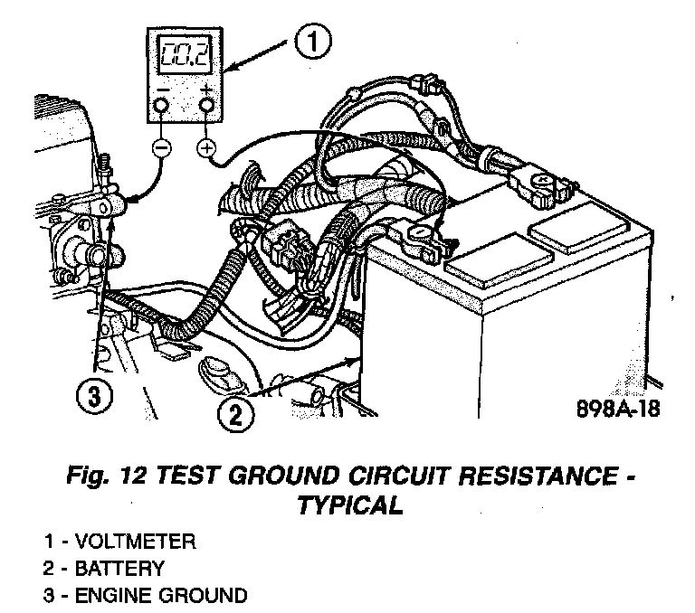 4. Connect the voltmeter to measure between the battery negative cable terminal clamp and a good clean ground on the engine block (Fig. 12). Rotate and hold the ignition switch in the Start position. Observe the voltmeter. If the reading is above 0.2 volt, clean and tighten the battery negative cable eyelet terminal connection to the engine block. Repeat the test. If the reading is still above 0.2 volt, replace the faulty battery negative cable.