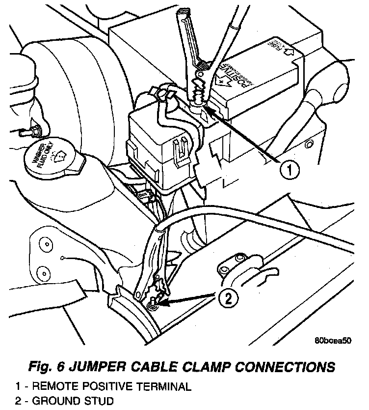 6. On disabled vehicle, connect RED jumper cable clamp to positive (+) terminal located on the left cowl. Connect BLACK jumper cable clamp to chassis ground (Fig. 6).