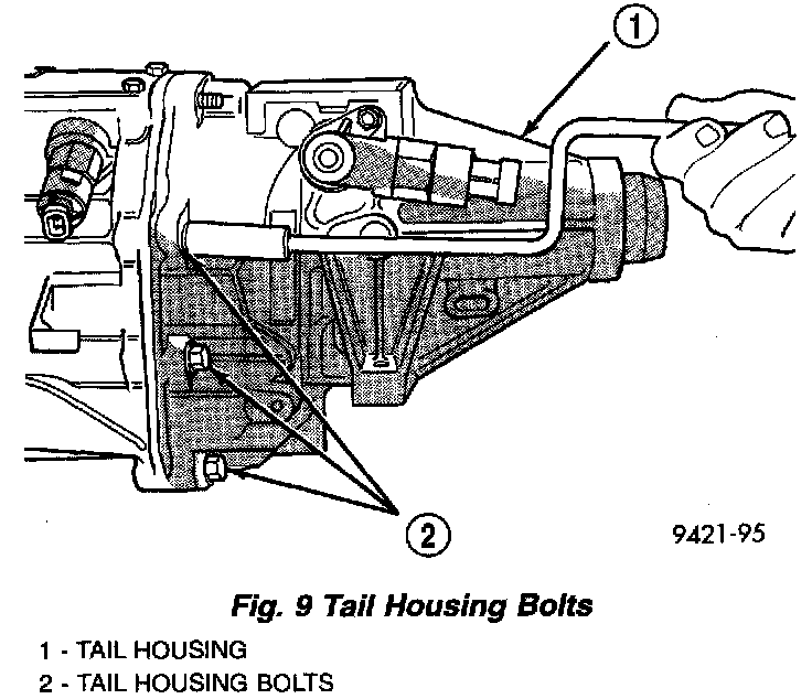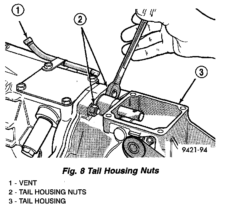 5. Remove the two tail housing nuts located at the top of the transmission tail housing (Fig. 8).