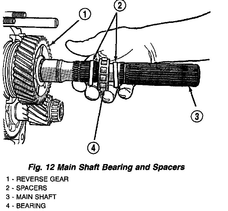 9. Remove main shaft roller bearing snap ring, roller bearing and spacers (Fig. 12).