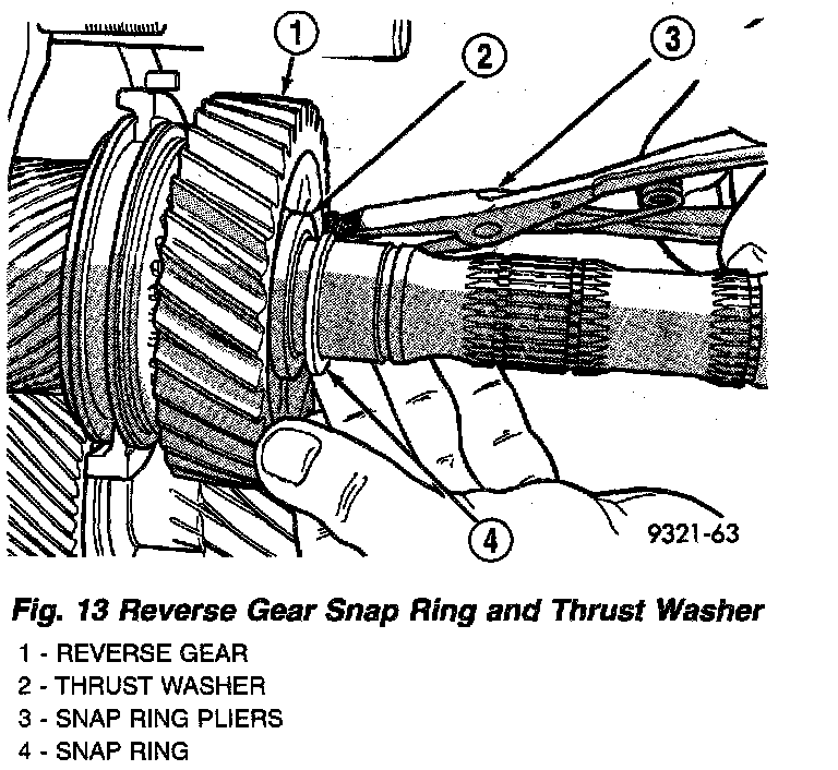 10. Remove reverse gear snap ring and thrust washer (Fig. 13).