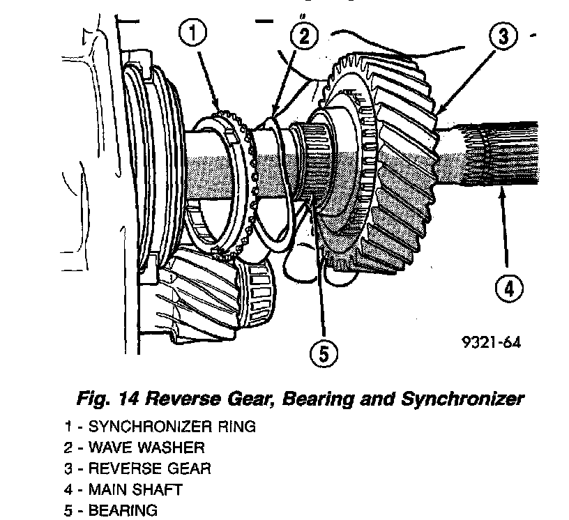11. Remove reverse gear, bearing, wave washer and brass synchronizer ring (Fig. 14).