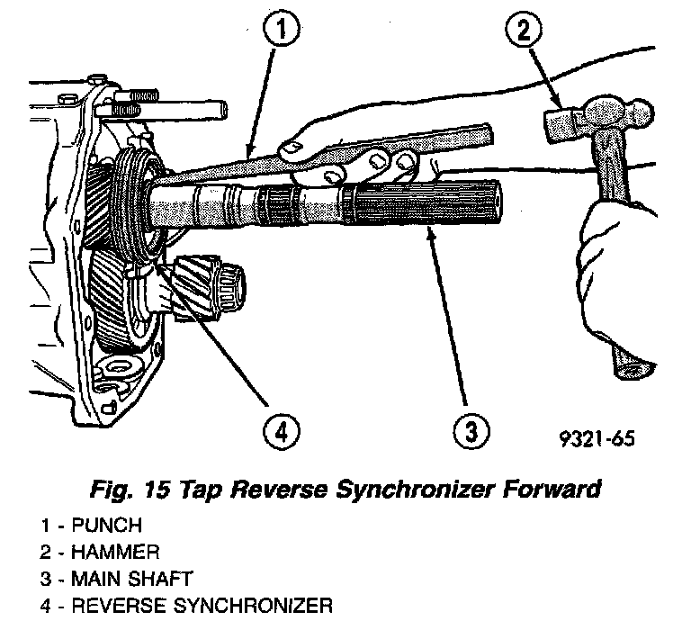 12. Under normal use the reverse synchronizer is forced against the snap ring. Lightly tap the reverse synchronizer forward (Fig. 15) to relieve pressure on the snap ring and remove the snap ring..