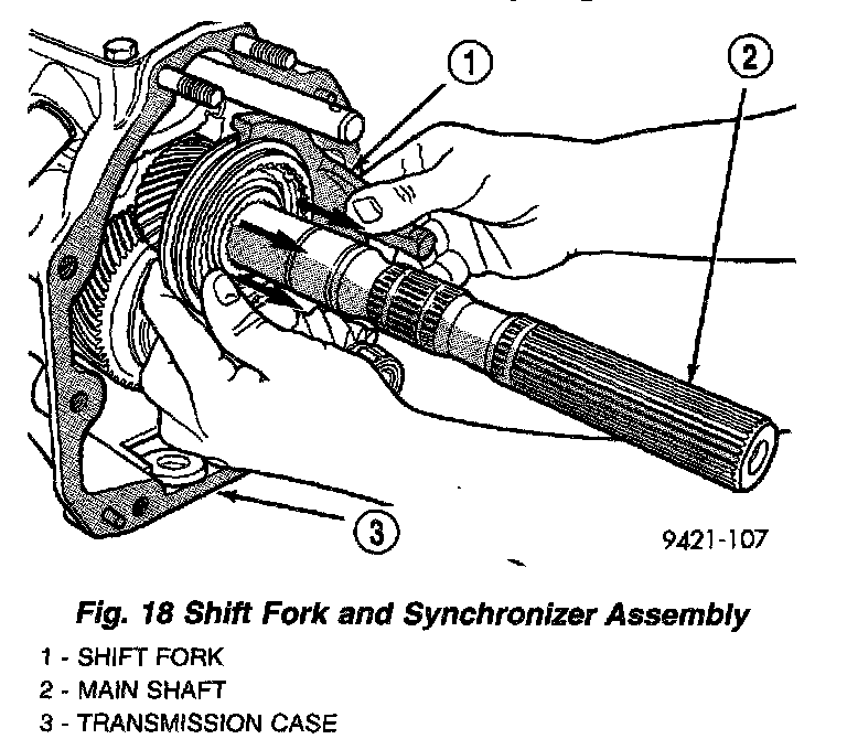 15. Remove shift fork and synchronizer sleeve from transmission as an assembly (Fig. 18).