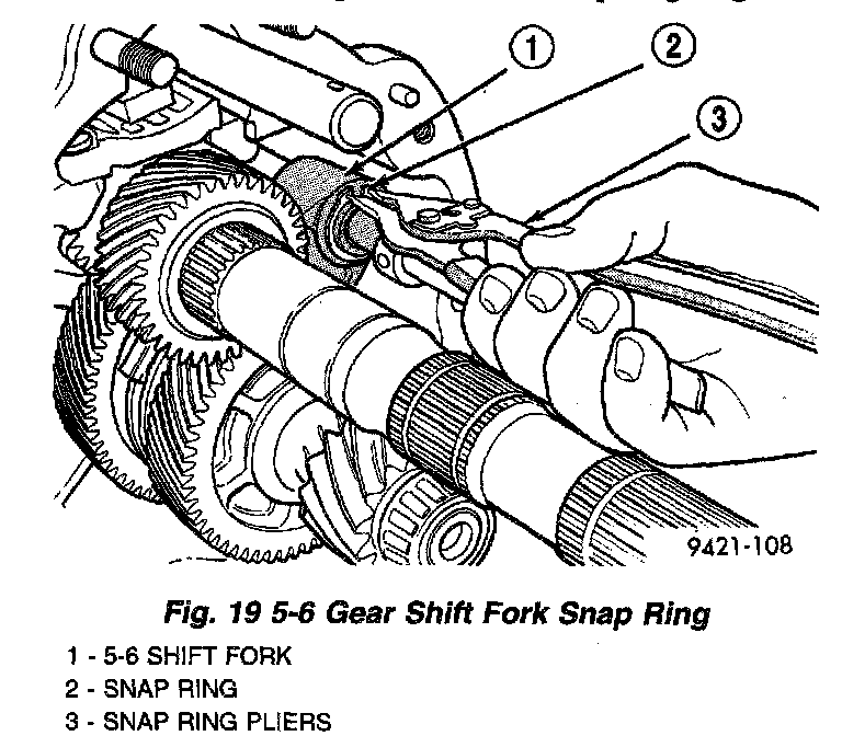 16. Remove 5-6 gear shift fork snap ring (Fig. 19).