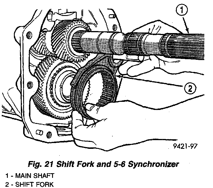 18. Remove shift fork and 5-6 synchronizer sleeve (Fig. 21).