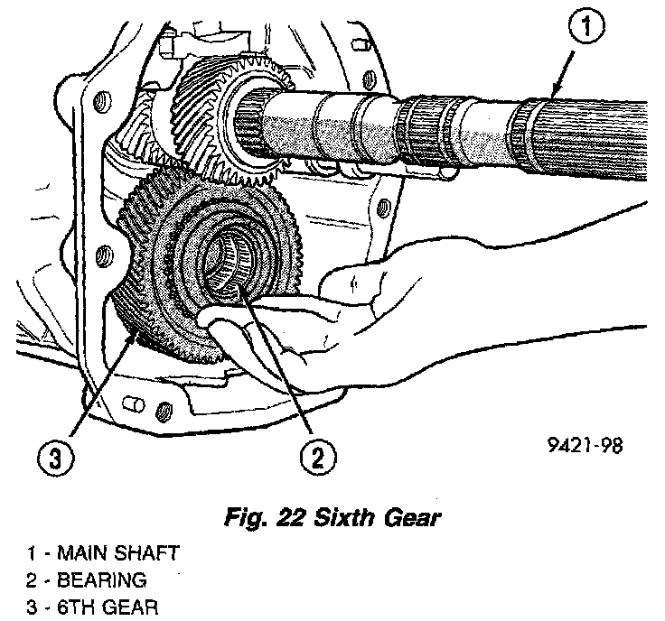 19. Remove sixth gear, bearing and thrust washer (Fig. 22).
