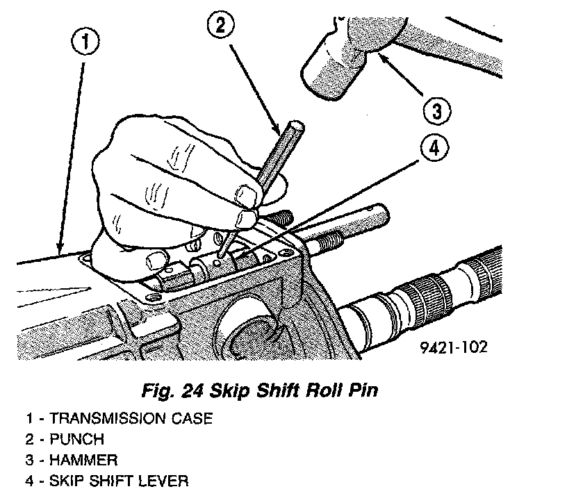 21. Remove roll pin from skip shift lever (Fig. 24). Then slide skip shift lever off of shaft. Note the direction for assembly.
