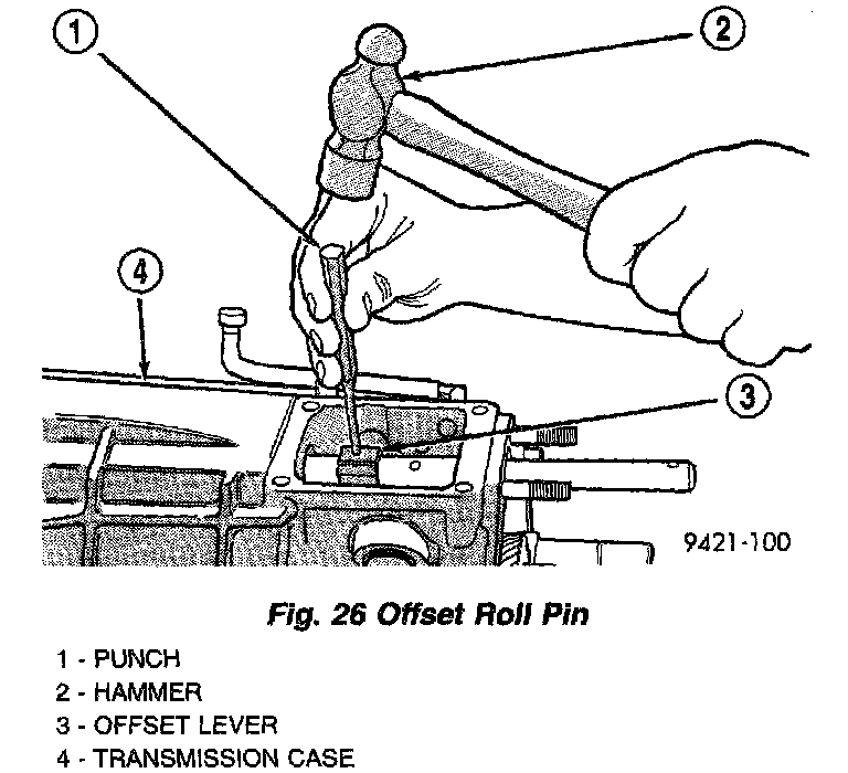 23. Drive roll pin down into front offset lever until it is loose (Fig. 26).