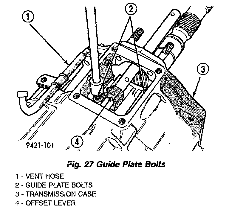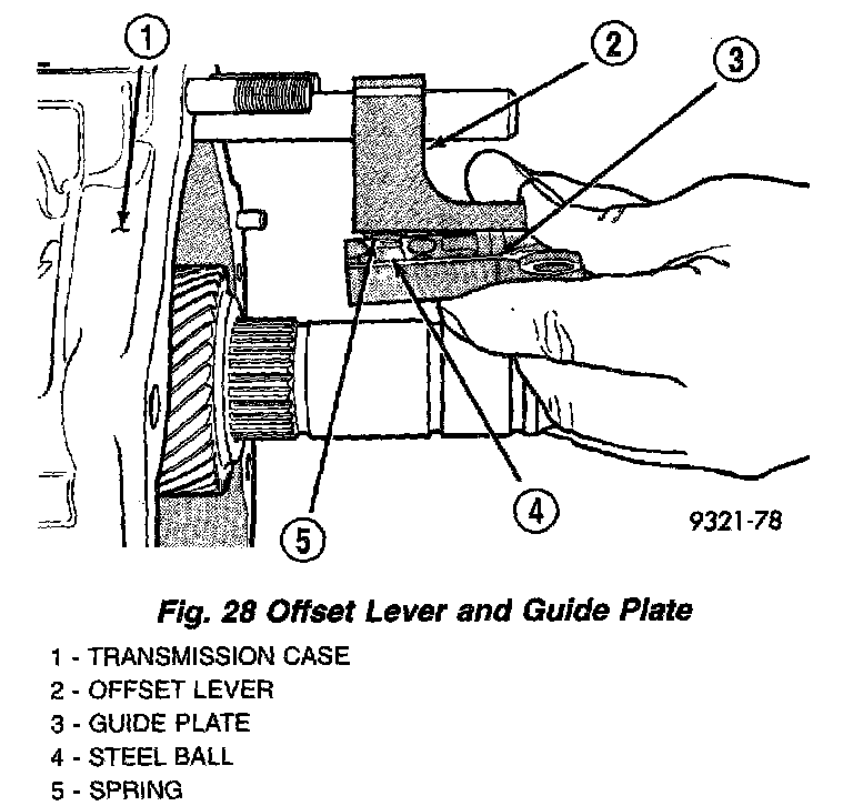 25. Slide offset lever and guide plate out the rear of the transmission (Fig. 28).
