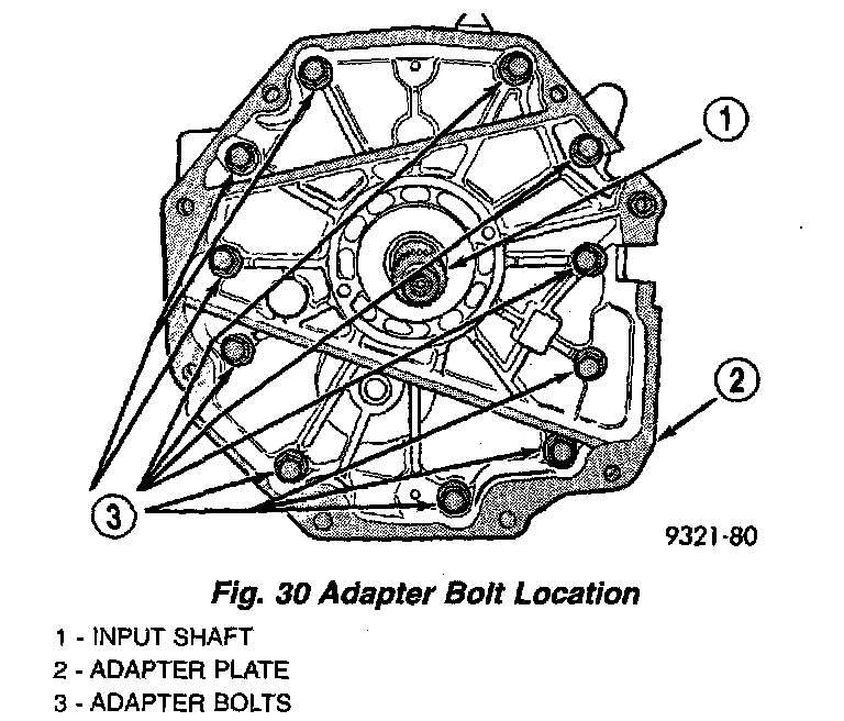 30. Remove 11 front adapter bolts (Fig. 30). Leave one bolt in temporarily to hold the transmission front adapter in place.