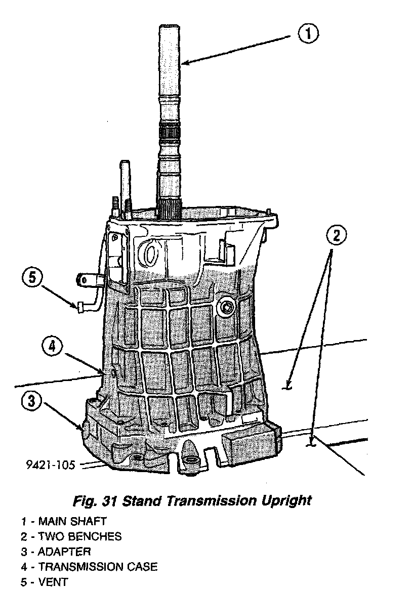31. Stand the transmission on front adapter (Fig. 31). You will have to place the transmission between two benches or have a hole in your bench to allow the input shaft to hang freely.