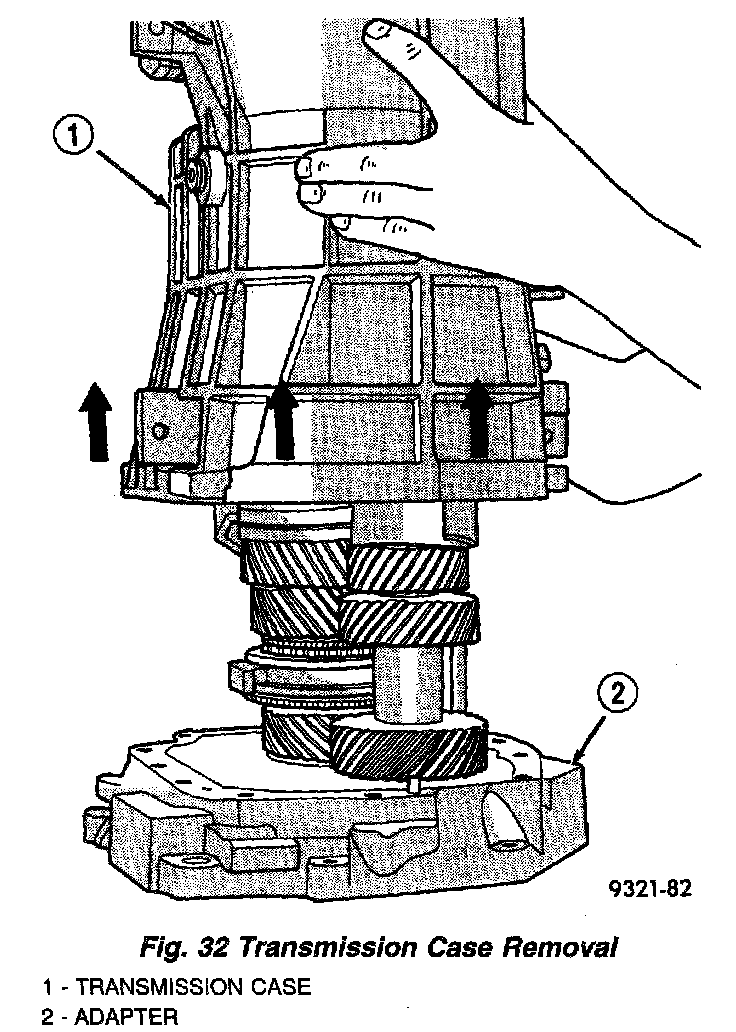 32. Remove the one bolt left in the adapter. Then pry transmission case upward, away from front adapter and remove case (Fig. 32).