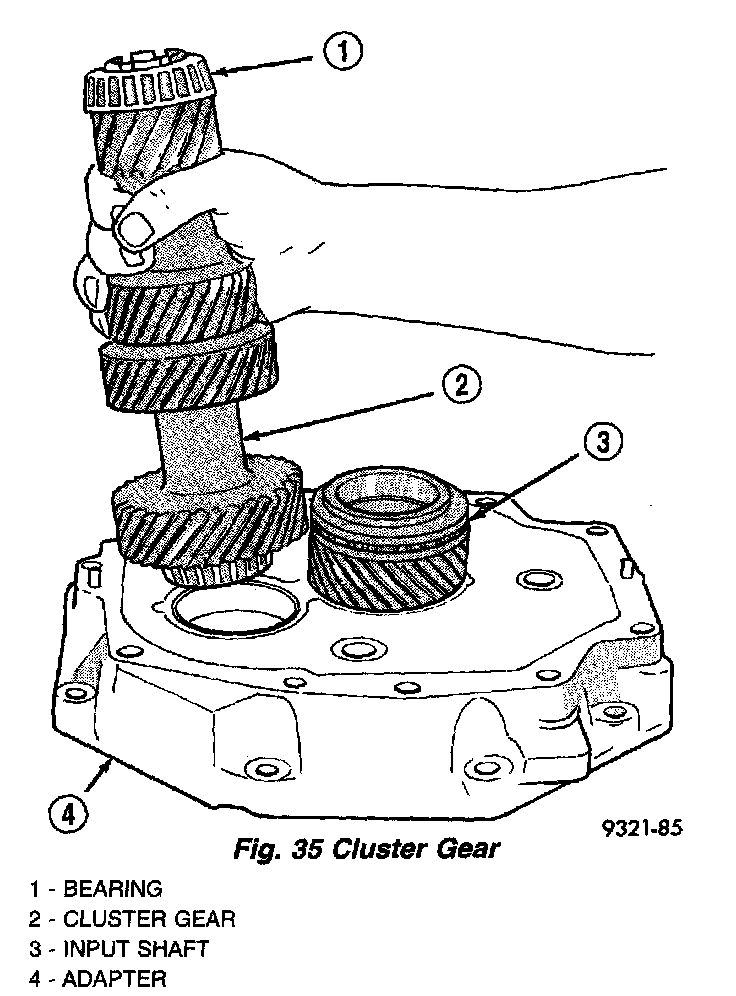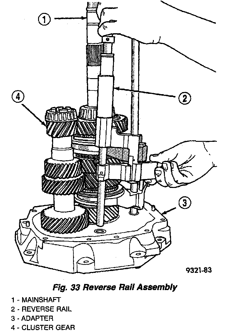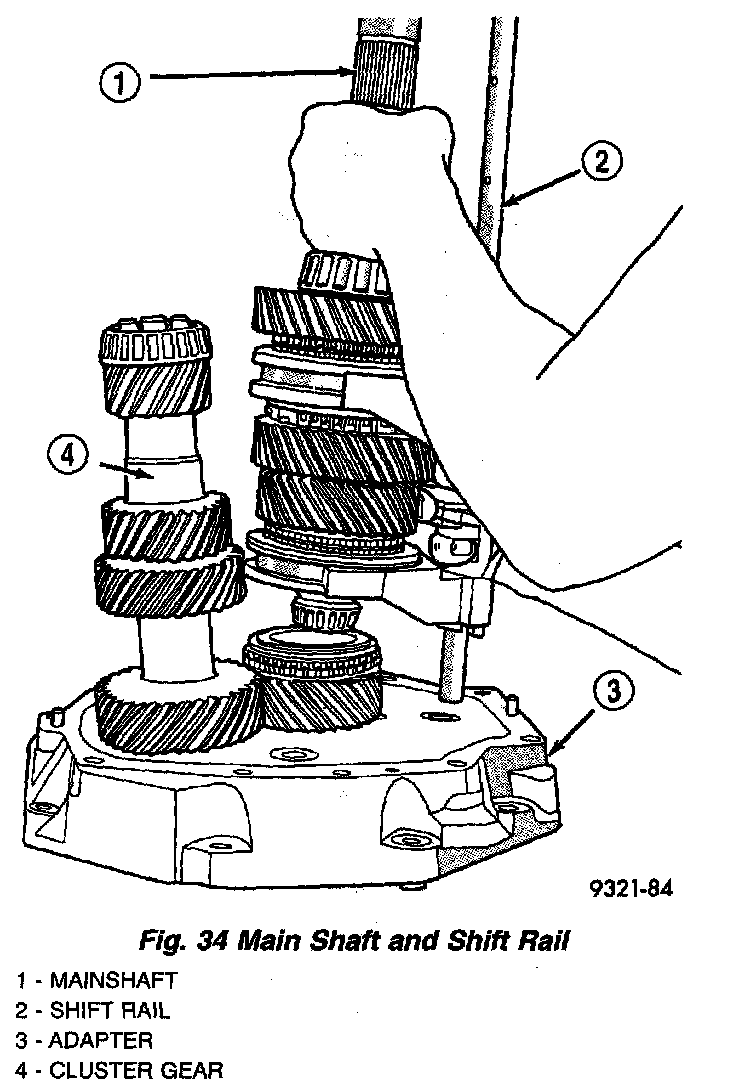 34. Tilt cluster gear sideways. Then lift main shaft and shift rail assemblies out of the transmission (Fig. 34).