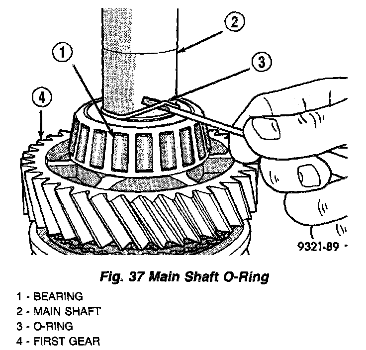 1. Remove main shaft O-ring (Fig. 37). This O-ring is used to hold the main shaft tapered bearing in place during the manufacturing of this transmission.
