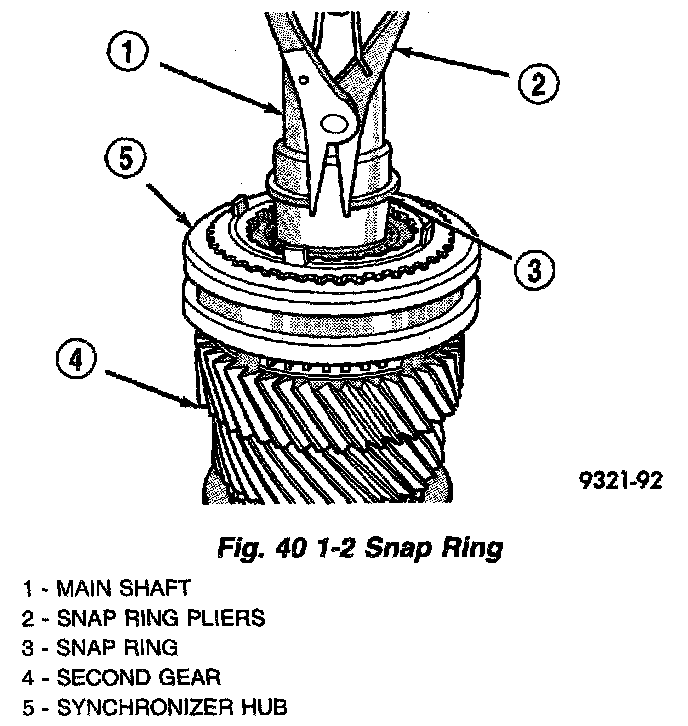 4. Remove 1-2 snap ring with snap ring pliers from main shaft (Fig. 40).