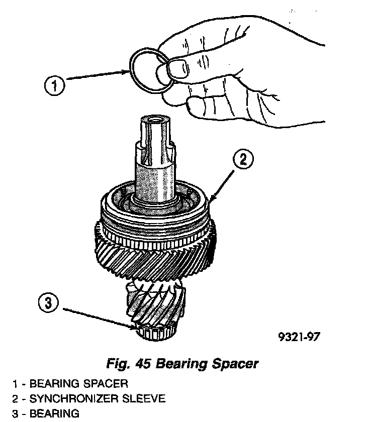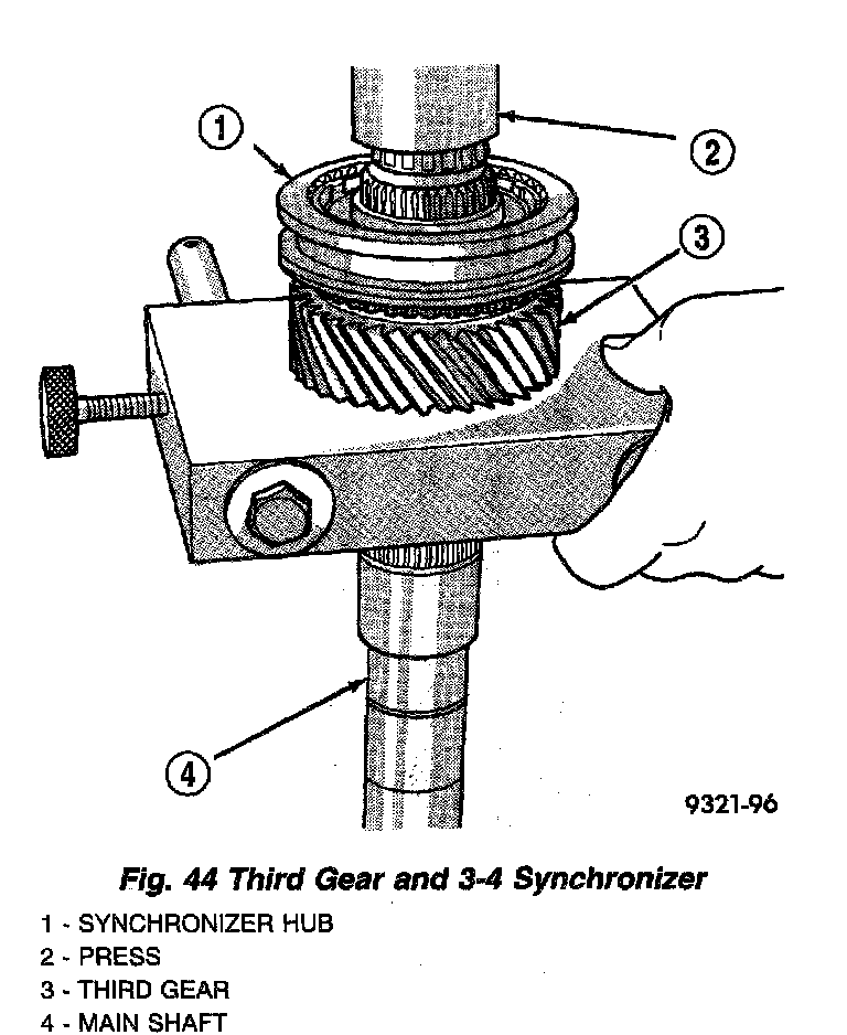 8. Using a press, remove third gear and 3-4 synchronizer hub and sleeve (Fig. 44).