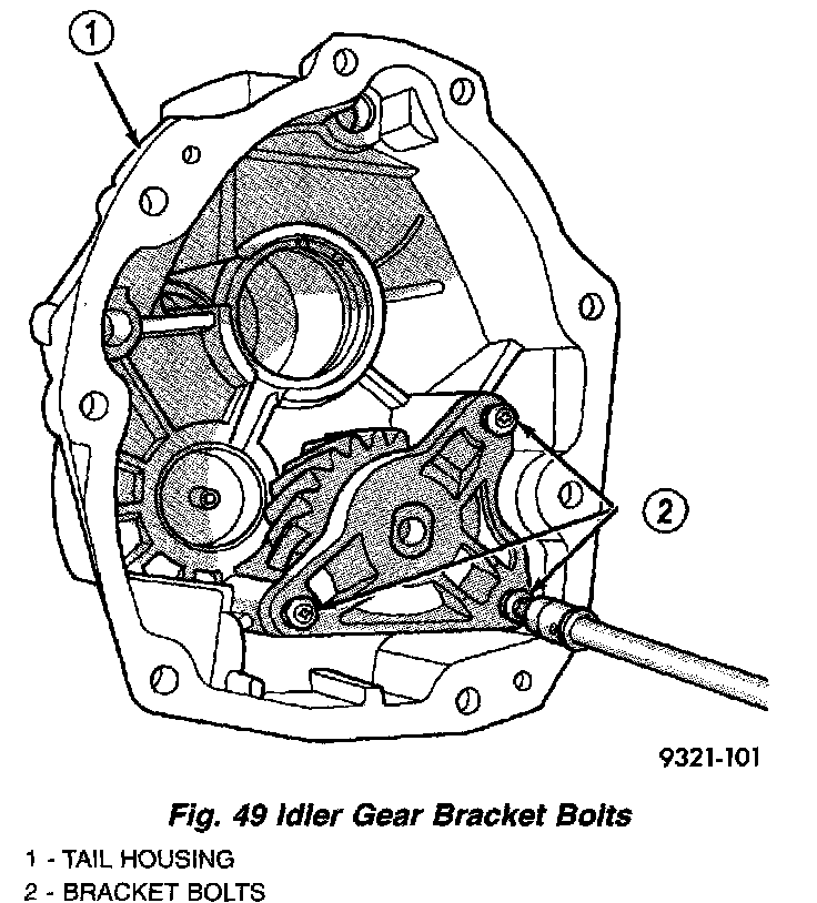 1. Remove the idler gear bracket bolts (Fig. 49). Then remove the bracket.