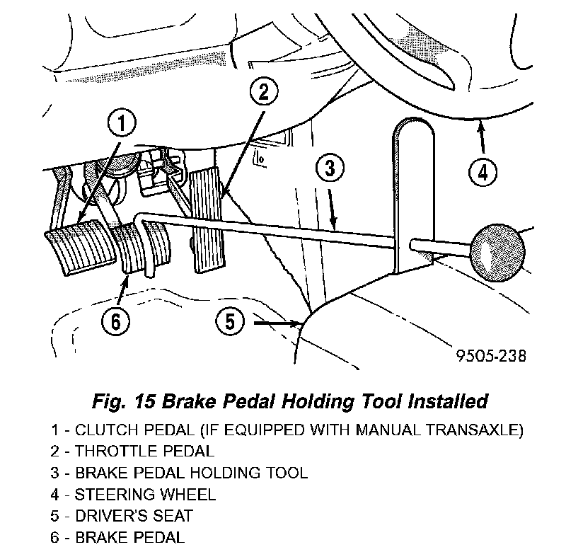 3. Using a brake pedal positioning tool such as shown, depress brake pedal past its first 1 inch of travel and hold in this position. This will isolate the master cylinder reservoir from the brake hydraulic system, not allowing the brake fluid to drain out of the reservoir.
