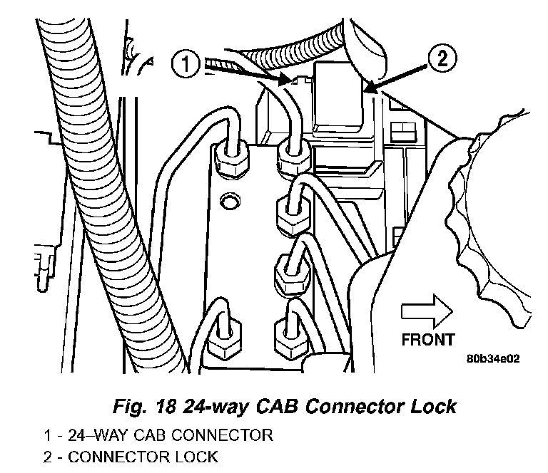 10. Disconnect the 24-way wiring harness connector from the CAB using the following procedure. Grasp the lock on the 24-way connector, and pull it up from the connector as far as possible. This will unlock and raise the 24-way connector out of the socket on the CAB.