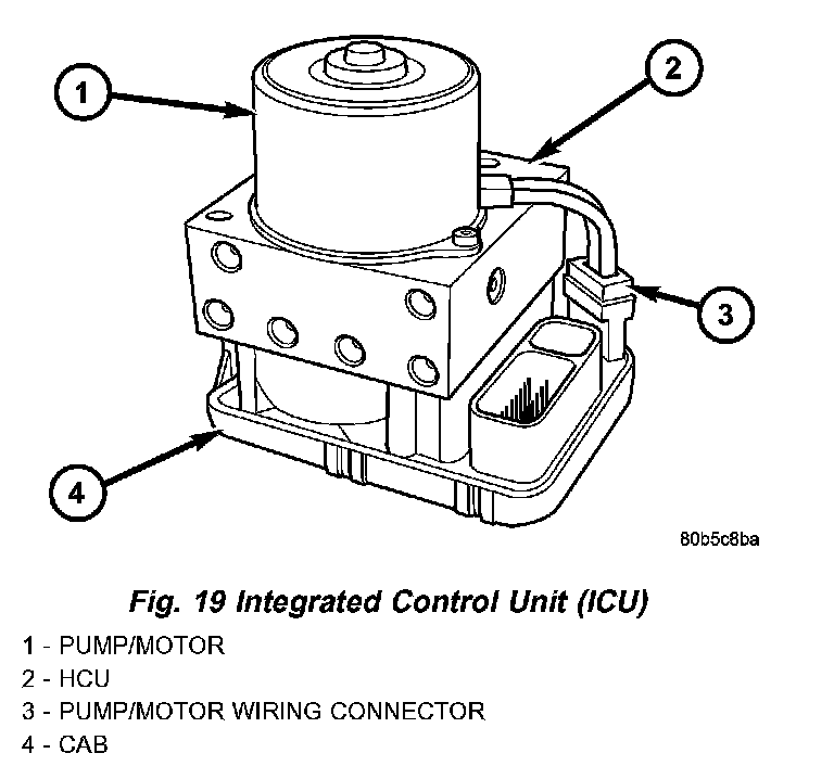 NOTE: To replace the hydraulic control unit (HCU) or the controller antilock brake (CAB) on this vehicle, the entire integrated control unit (ICU) needs to be removed from the vehicle. The CAB can then be separated from the HCU. Do not attempt to replace the CAB with the ICU mounted in the vehicle.