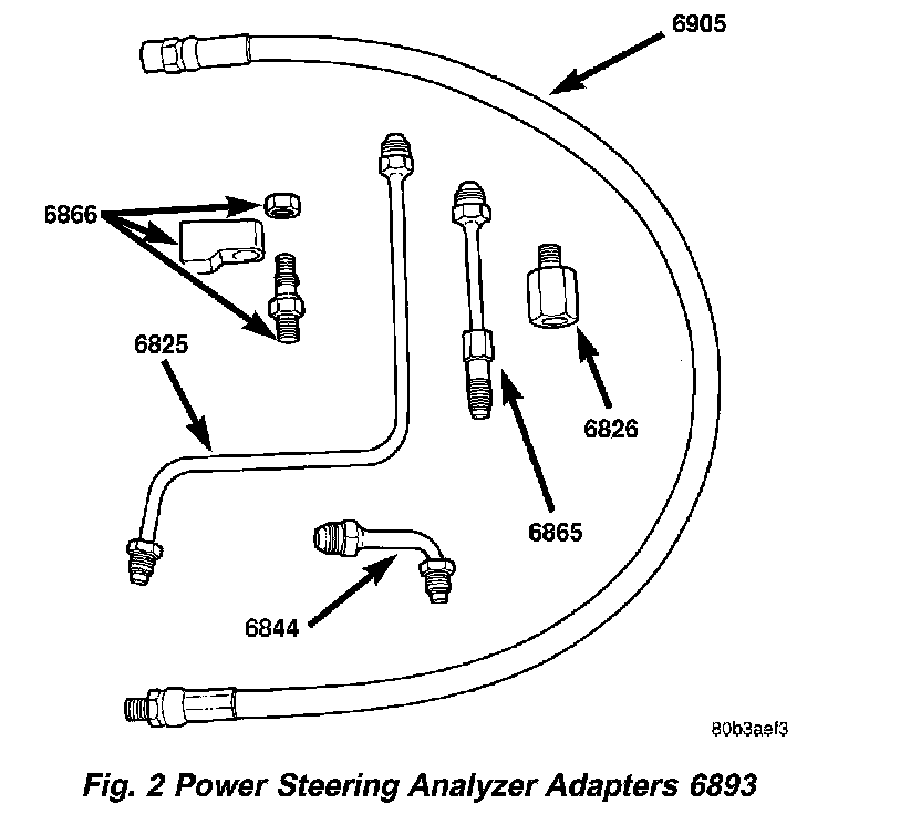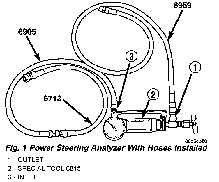 The following procedure is to be used to test the operation of the power steering system on this vehicle. This test will provide the flow rate of the power steering pump along with the maximum relief pressure. This test is to be performed any time a power steering system problem is present to determine if the power steering pump or power steering gear is not functioning properly. The following flow and pressure test is performed using the Power Steering Analyzer Kit, Special Tool 6815, hoses, Special Tools 6905 and 6959, and fittings from adapter kit, Special Tool 6893.