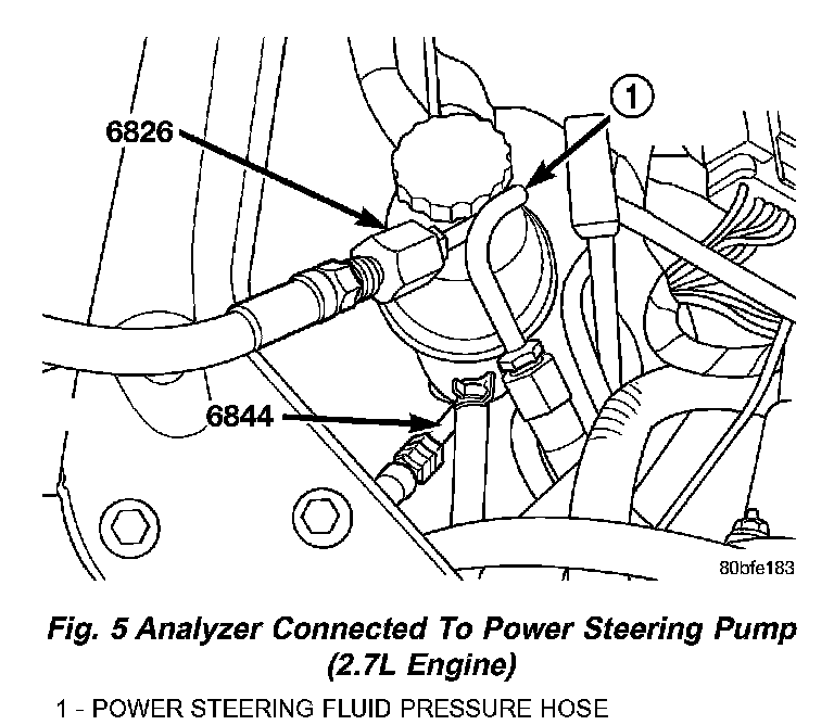 4. 2.7L engine-Connect Adapter Fitting, Special Tool 6844, attached to pressure hose from inlet (gauge end) of Power Steering Analyzer to the pressure fitting on the power steering pump.