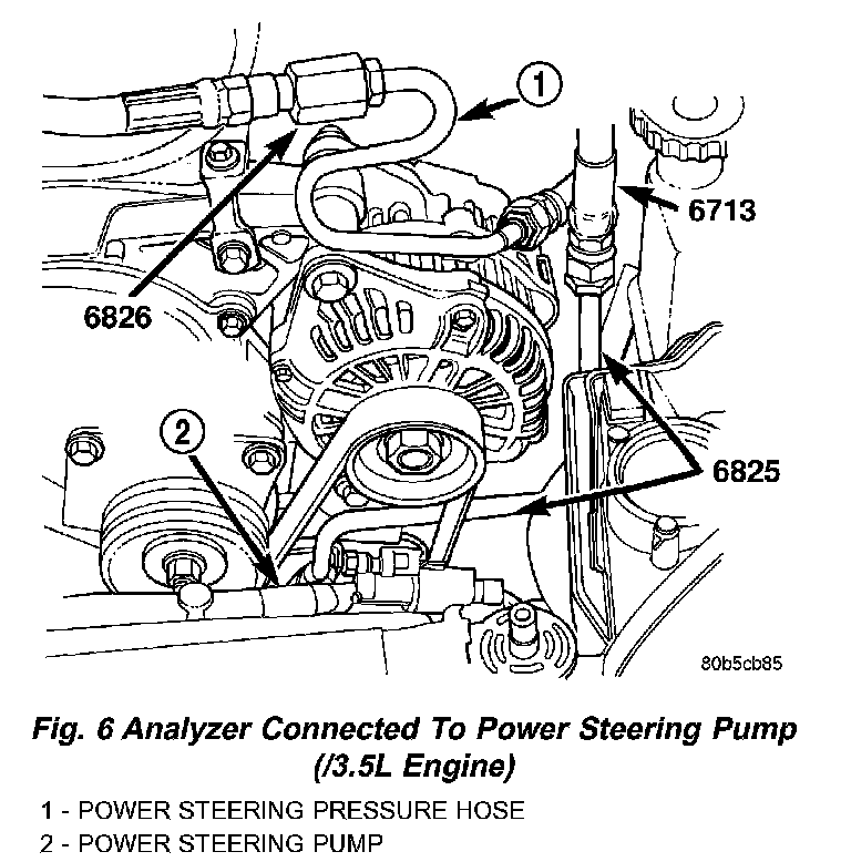 5. 3.5L engine-Connect Adapter Fitting, Special Tool 6825, attached to pressure hose from inlet (gauge end) of Power Steering Analyzer to the pressure fitting on the power steering pump.