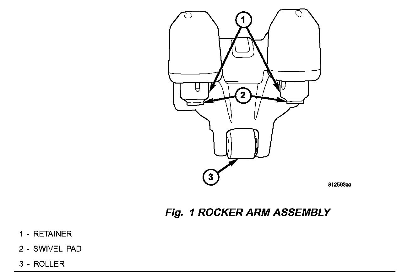 If this procedure has already been performed on this vehicle the swivel pad retainers will be colored blue and the swivel pads will be copper in color on the exhaust rocker arm assembly (Fig. 1).