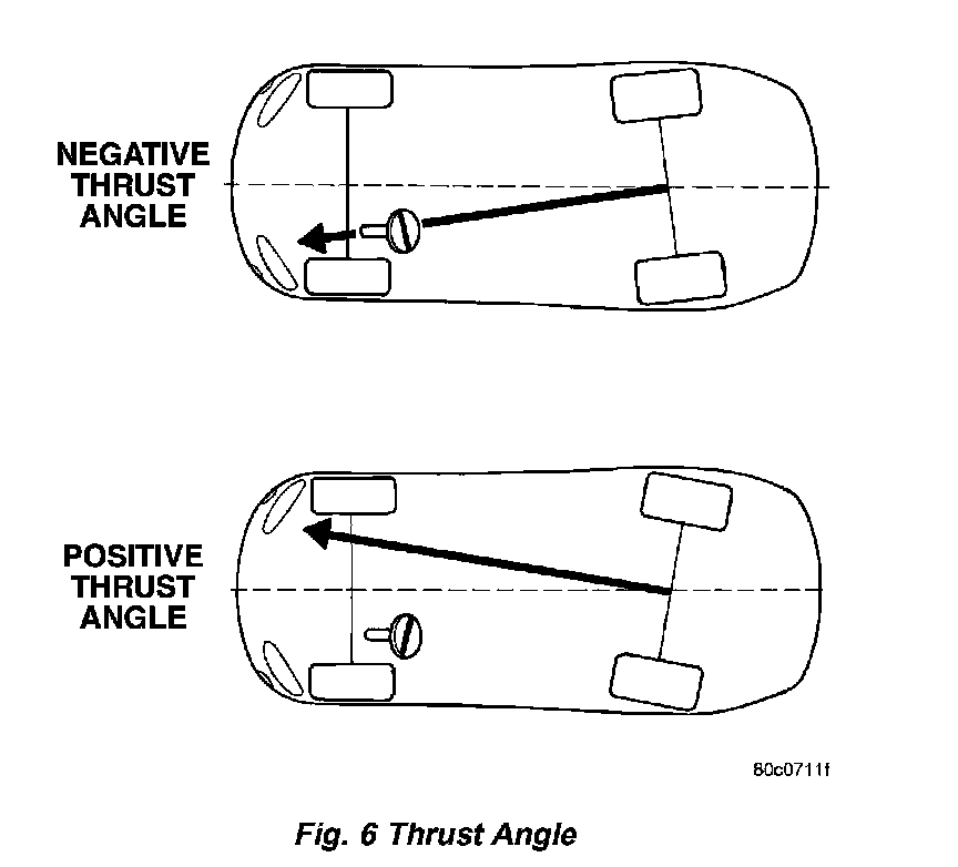 Thrust angle is the averaged direction the rear wheels are pointing in relation to the vehicle's center line. The presence of negative or positive thrust angle causes the rear tires to track improperly to the left or right of the front tires (dog tracking).