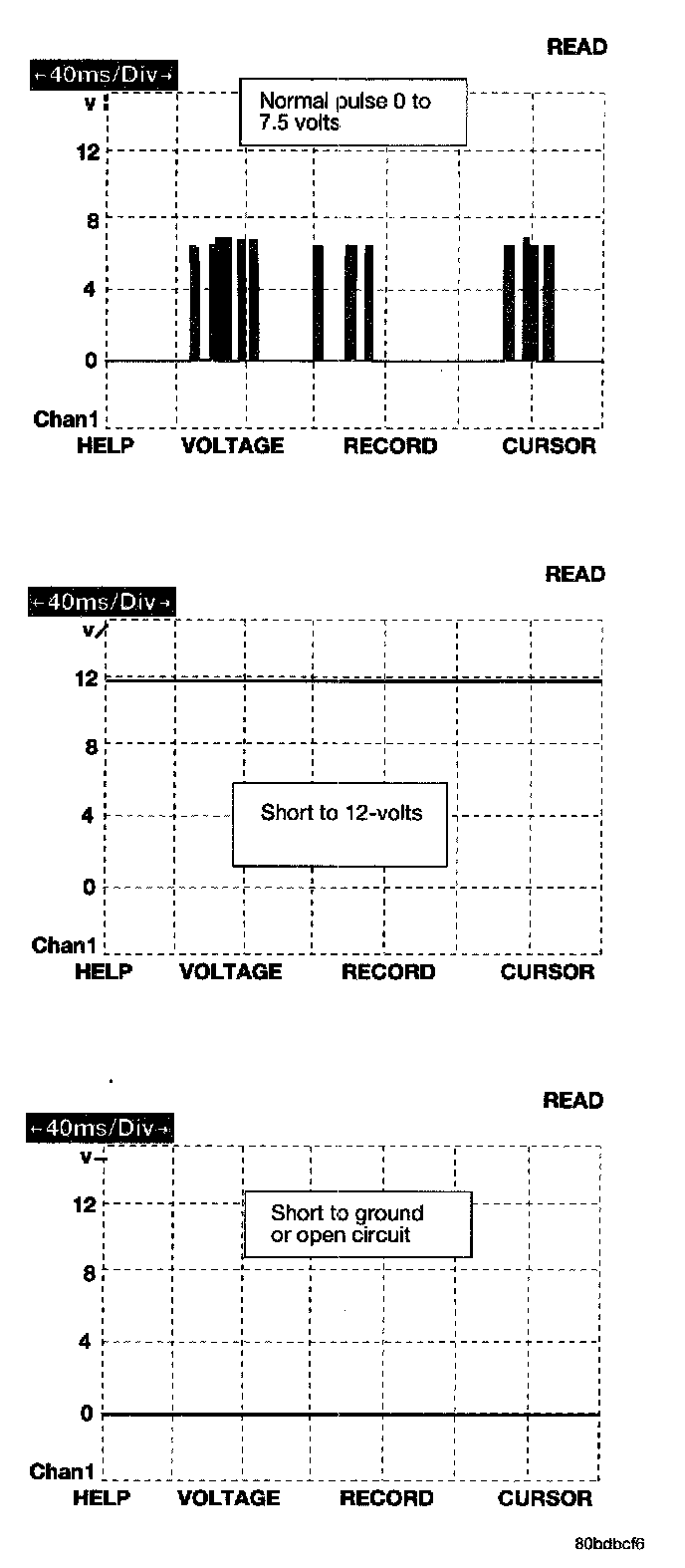 The bus messages are transmitted at a rate averaging 10800 bits per second. Since there is only voltage present when the modules transmit and the message length is only about 500 milliseconds, it is ineffective to try and measure the bus activity with a conventional voltmeter. The preferred method is to use the DRB III(R) lab scope. The 12 V square wave selection on the 20-volt scale provides a good view of the bus activity. Voltage on the bus should pulse between zero and about seven and a half volts. Refer to the diagram for some typical displays.