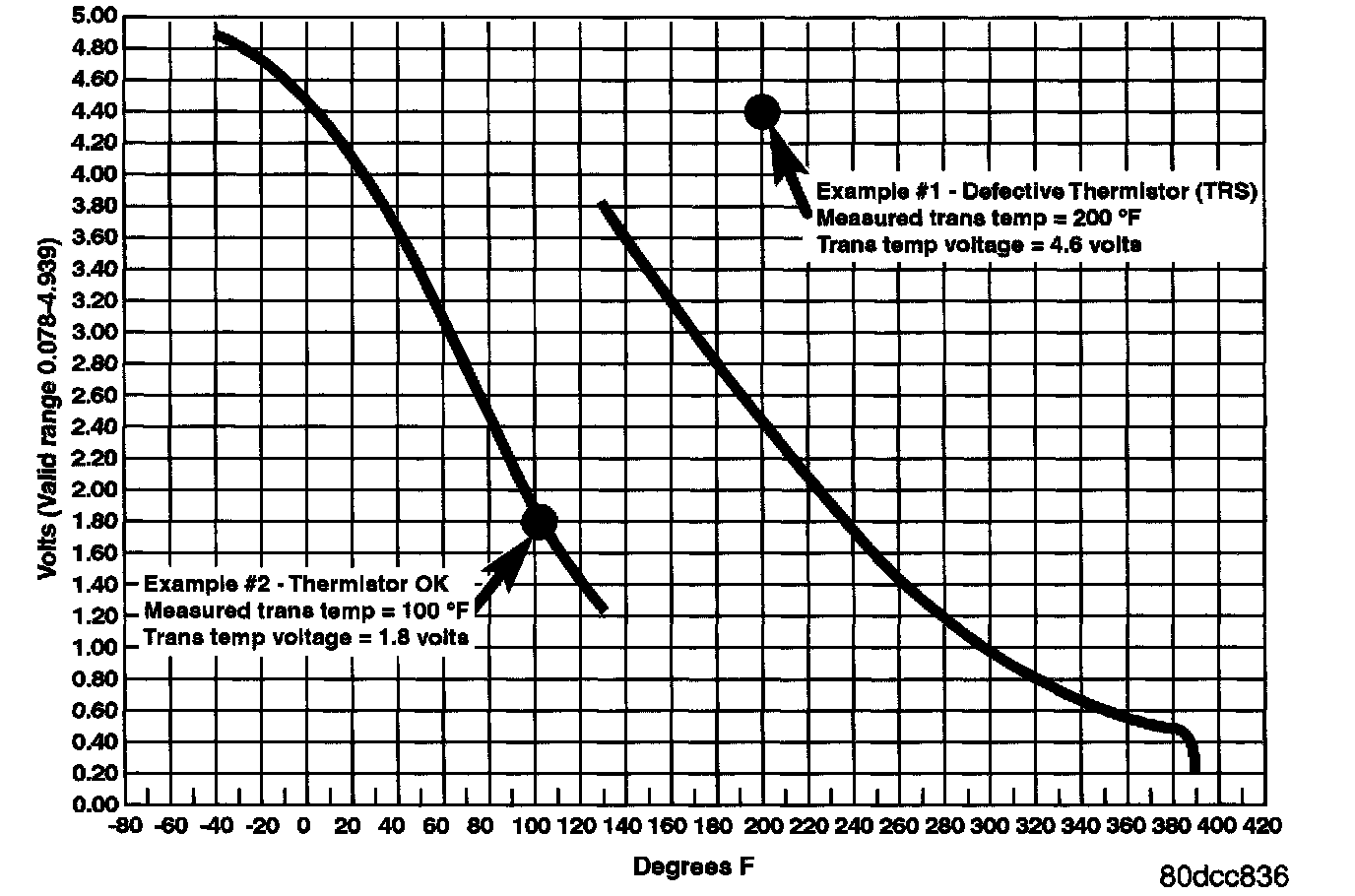 TRANSMISSION TEMPERATURE SENSORTRANSMISSION TEMPERATURE SENSOR (DUAL RANGE) START ENGINE. WITH DRB, MONITOR AND RECORD TRANSMISSION TEMPERATURE VOLTAGE. COMPARE THE MEASURED TEMPERATURE AND VOLTAGE WITH THE GRAPH SHOWN. THE MEASURED VALUE SHOULD FALL ON ONE OF THE LINES ON THE GRAPH.