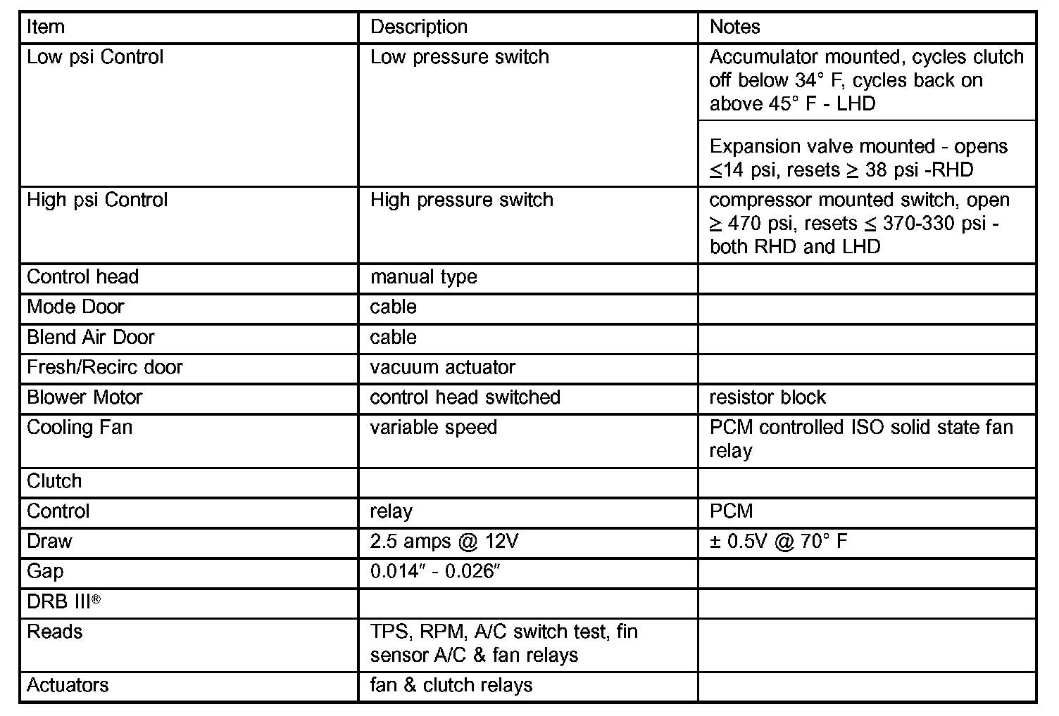 A/C Application Table: