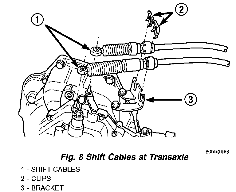16. Connect shift crossover and selector cables to shift lever. Install cables to bracket and install retaining clips (Fig. 8).