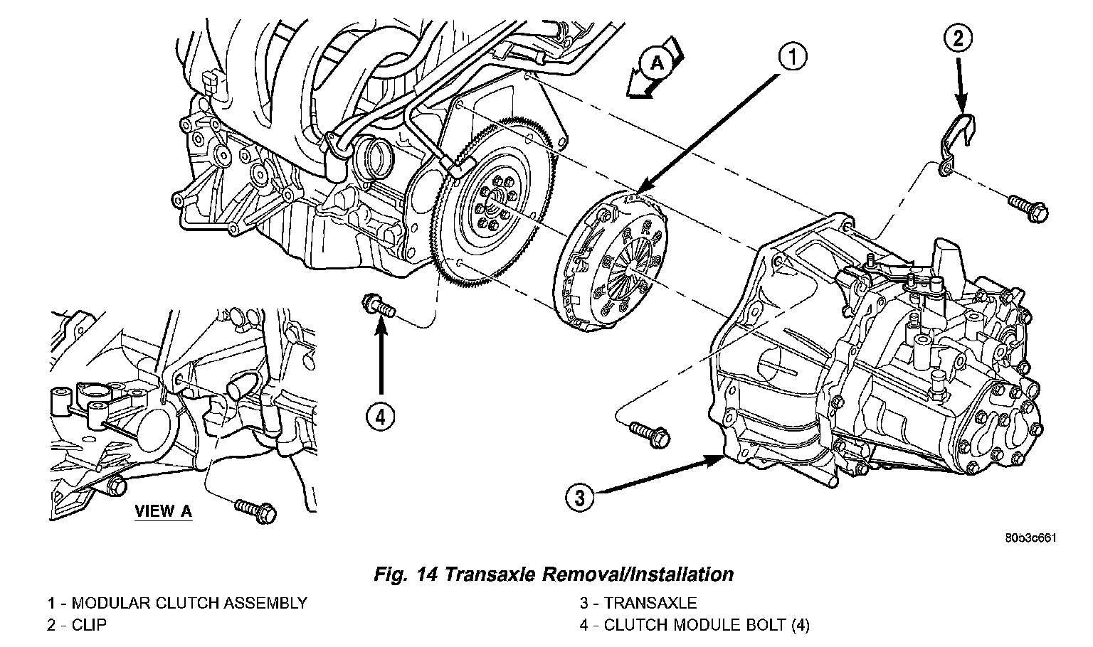 2. Install transaxle-to-engine mounting bolts (Fig. 14) and tighten to 95 Nm (70 ft. lbs.) torque.