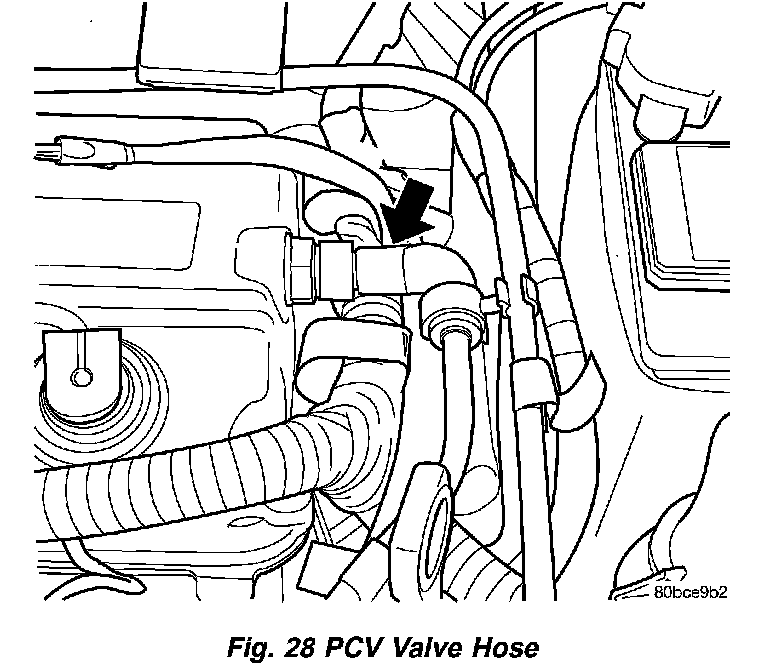 1. Disconnect make-up air (Fig. 27) and PCV (Fig. 28) hoses from cylinder head cover.