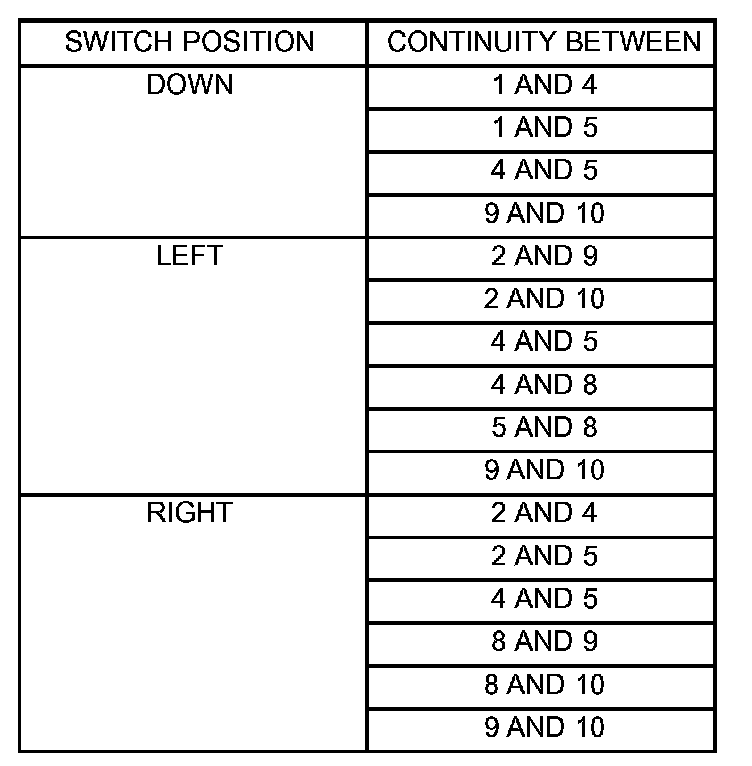4. If results shown in the table are not obtained, replace the switch.