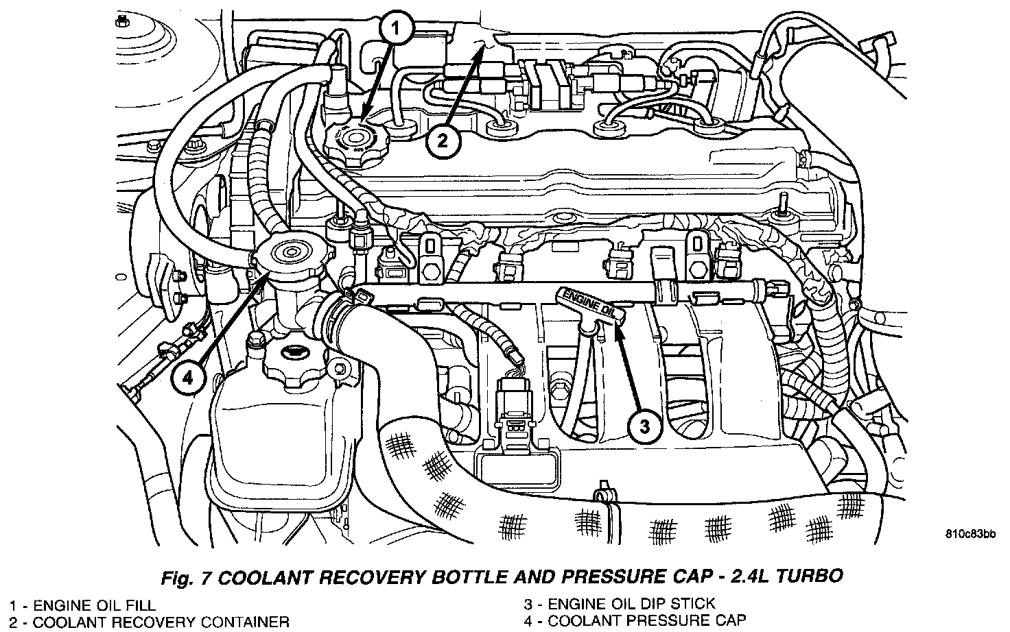 When servicing requires a coolant level check in the radiator, the engine must be off and not under pressure. Drain several ounces of coolant from the radiator drain cock while observing the coolant recovery container. Coolant level in the container should drop slightly. Remove the pressure cap. The radiator should be full to the top. If not, and the coolant level in the recovery container is at the ADD mark, there is a air leak in the coolant recovery system. Check hose or hose connections to the recovery container, outlet connector neck or the pressure cap seal at outlet connector for leaks.