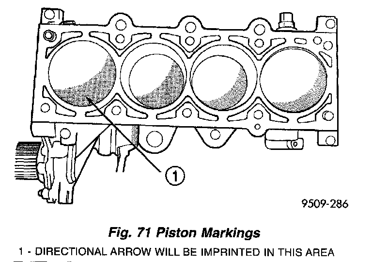 5. Pistons have a directional stamping in the front half of the piston facing towards the front of engine (Fig. 71).