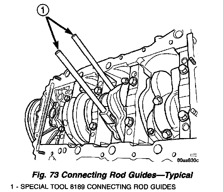 7. Install connecting rod upper bearing half into connecting rod. Install Special Tool 8189, connecting rod guides onto connecting rod (Fig. 73).