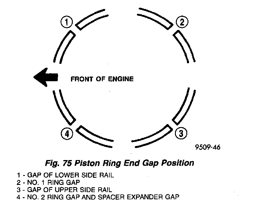 3. Before installing the ring compressor, make sure the oil ring expander ends are butted and the rail gaps located as shown in (Fig. 75). As viewed from top.