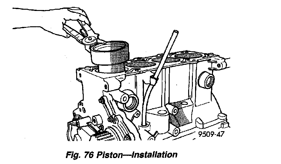 4. Immerse the piston head and rings in clean engine oil, slide the ring compressor, over the piston (Fig. 76). Be sure position of rings does not change during this operation .