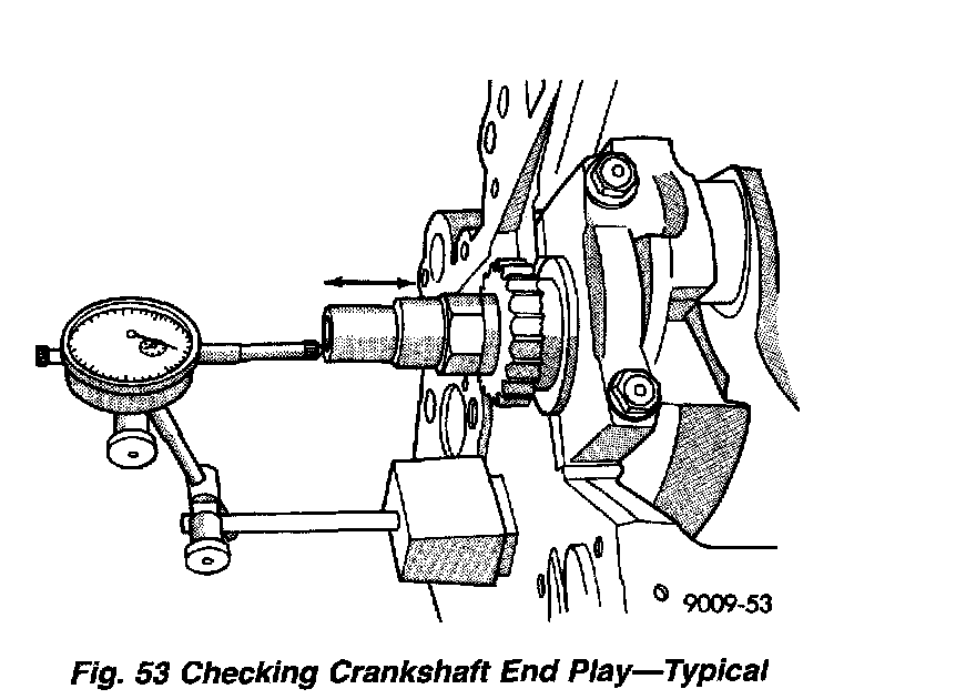 1. Mount a dial indicator to front of engine with the locating probe on nose of crankshaft (Fig. 53).