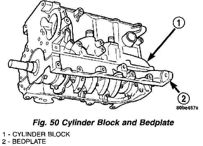 The cast iron cylinder block is a two-piece assembly, consisting of the cylinder block and bedplate (Fig. 50). The bedplate incorporates the main bearing caps and bolts to the cylinder block. This design offers a much stronger lower end and increased cylinder block rigidity. The rear oil seal retainer is integral with the block. The bedplate and block are serviced as an assembly.