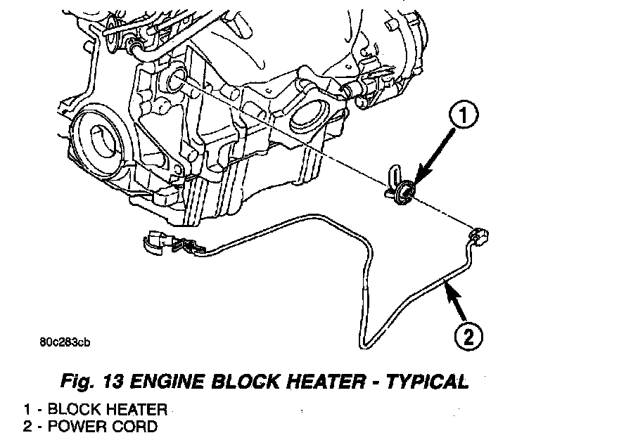 The heater is mounted in a core hole (in place of a core hole plug) in the engine block, with the heating element immersed in coolant (Fig. 13). The engine block heater is available as an optional accessory. The heater is powered by ordinary house current (110 Volt AC) through a power cord and connector.