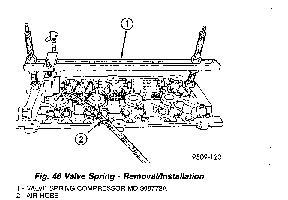 2. Install valve spring and retainer, use Special Tool MD-998772-A with adapter 6779 to compress valve springs only enough to install locks (Fig. 46). Correct alignment of tool is necessary to avoid nicking valve stems.