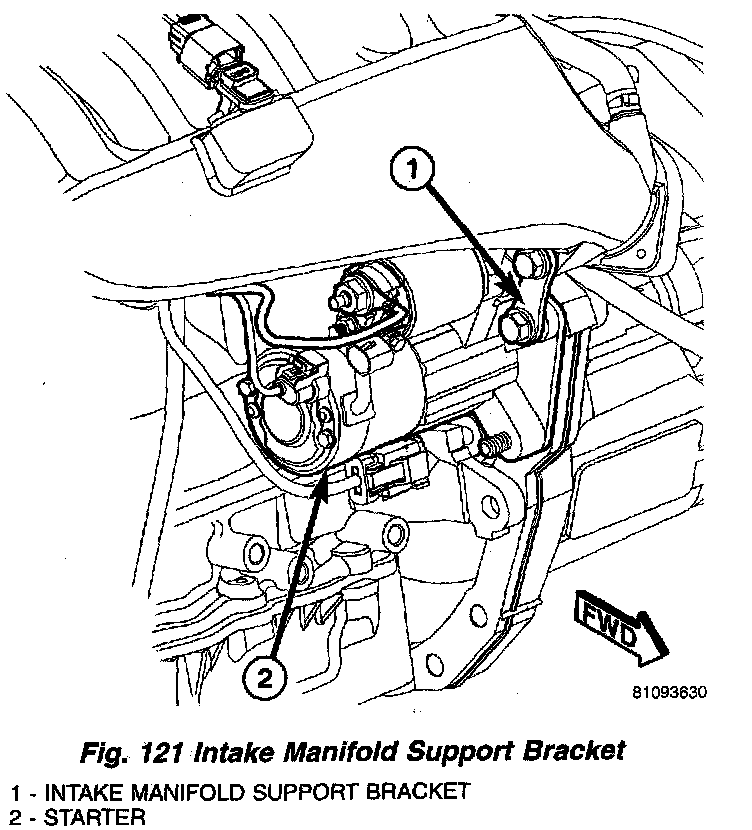 8. Install intake manifold support bracket. Tighten fasteners to 23 Nm (200 in. lbs.) (Fig. 121).