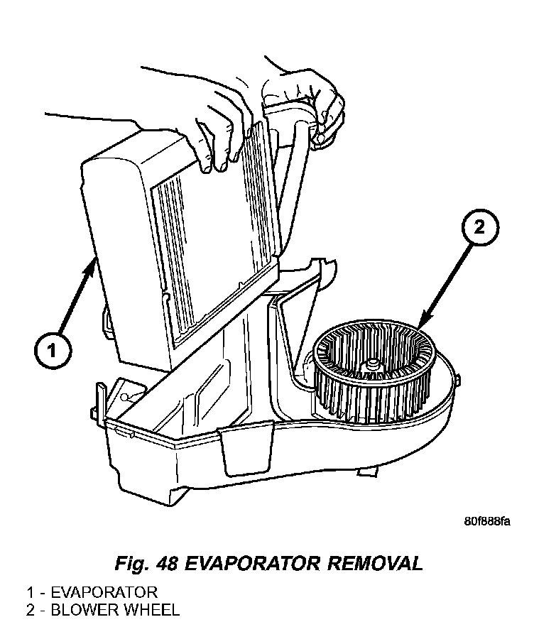This vehicle uses an aluminum plate and fin style evaporator. It is located in the Evaporator/Blower module. If evaporator is leaking or damaged it must be replaced.
